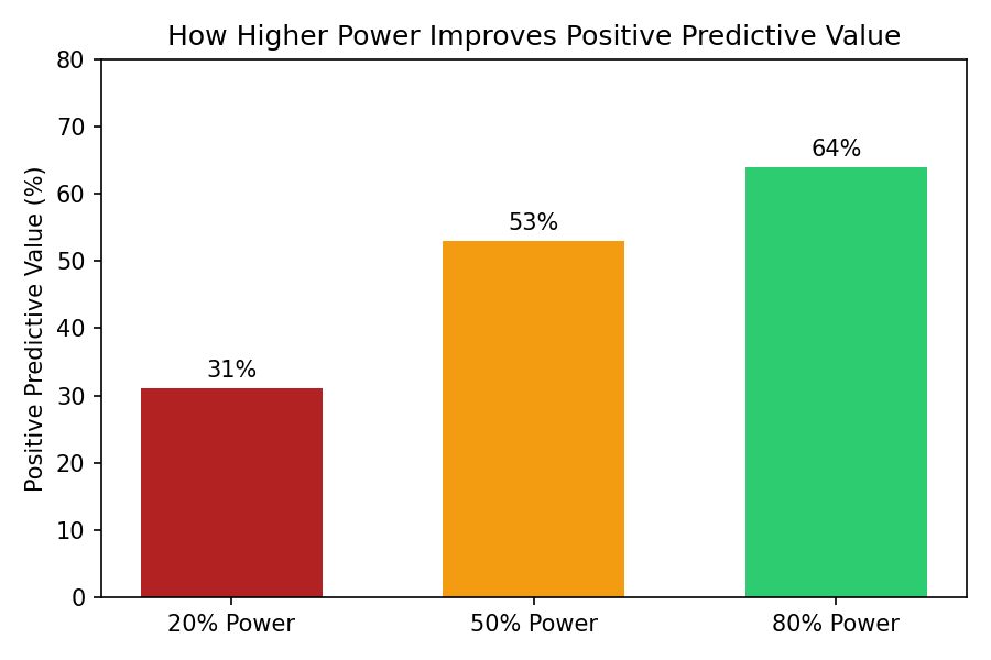 So, our test flags a total of 13 patients (4 true effects + 9 false positives). This means that when our test gives a positive result, it’s only correct 4 out of 13 times—just 31% of the time! That’s worse than a coin flip. A study this weak is practically useless.